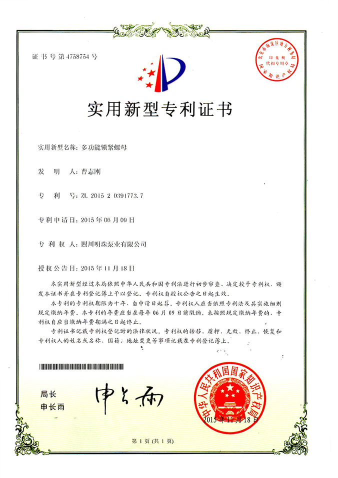 《立式多级离心泵性能检测快速装夹装置》实用新型专利证书