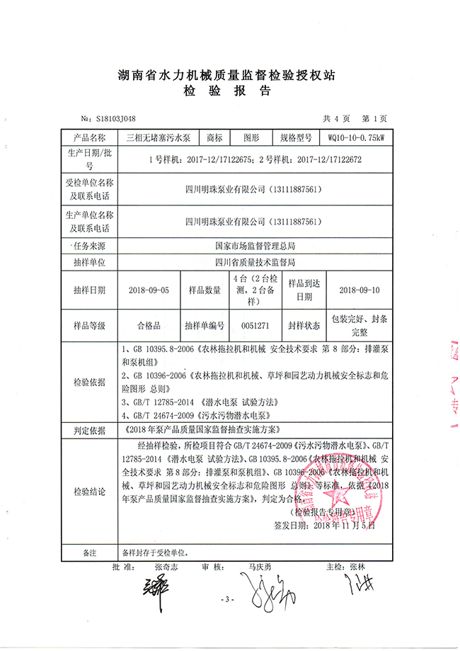 国家监督抽查三相无堵塞污水泵检验报告